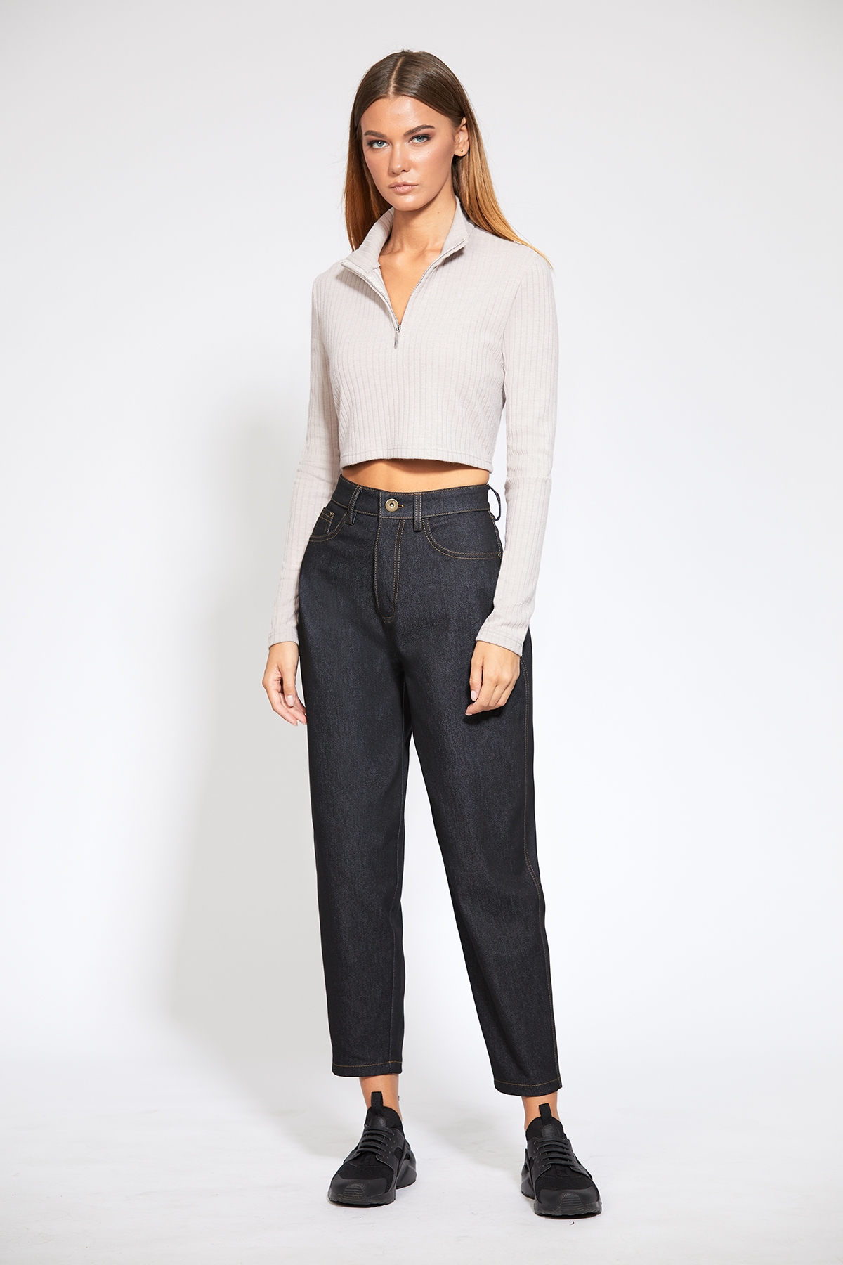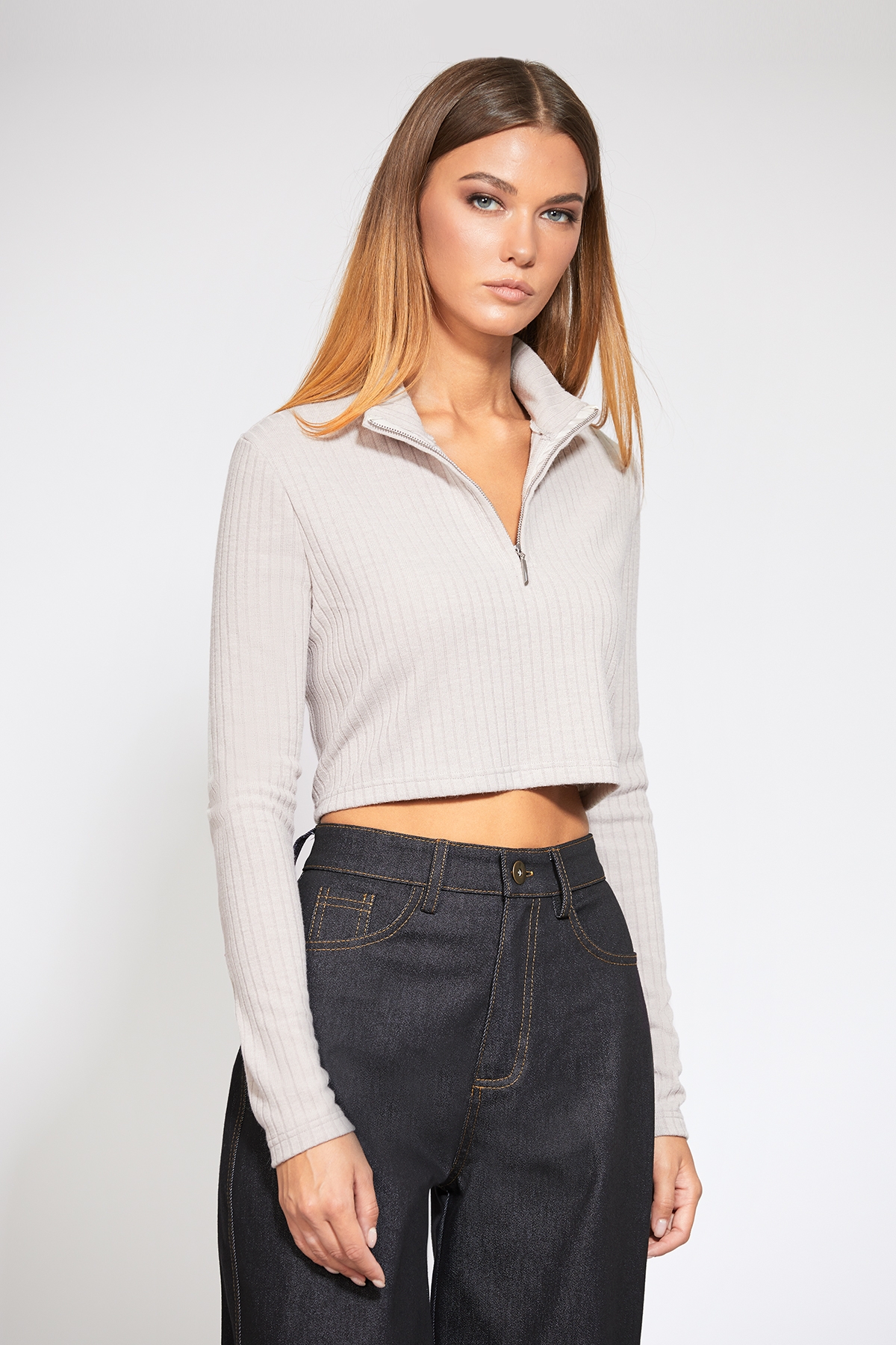 Джемпер выполнен из эластичного трикотажного полотна. Джемпер приталенного силуэта, длиной до линии бедер. Перед и спинка цельные. Воротник-стойка, застегивающийся спереди на металлическую молнию. Рукав втачной, одношовный.
